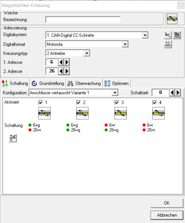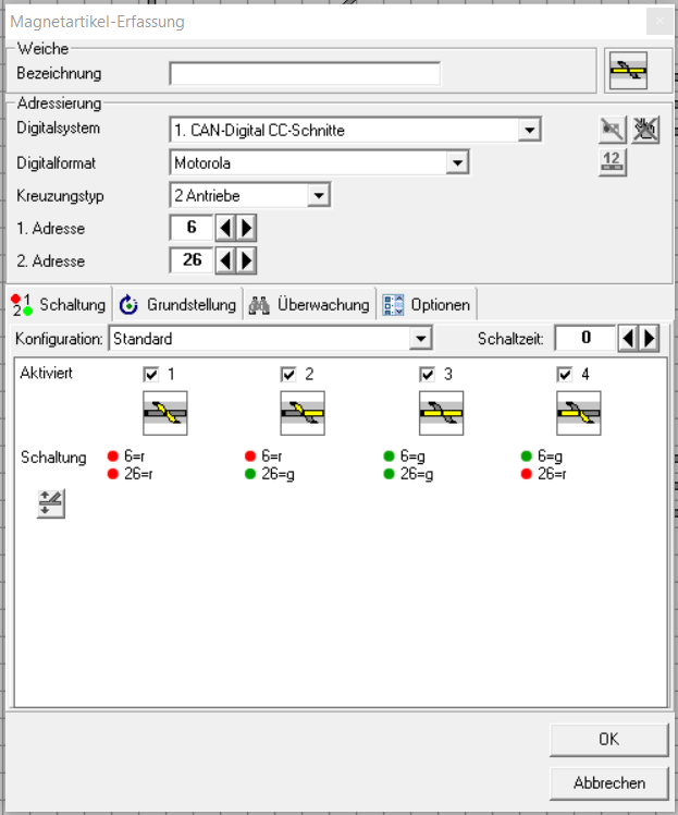 Nun die zweite Weiche (26) hinzugefügt und diese hat jetzt das DKW Symbol, ich vergebe die Adresse 26,- automatisch hat dann auch Weiche 6 die Adresse 26.